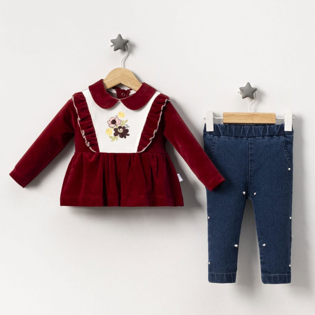 Βρεφικό Σετ Βελούδινο Με Τζιν Μπορντό