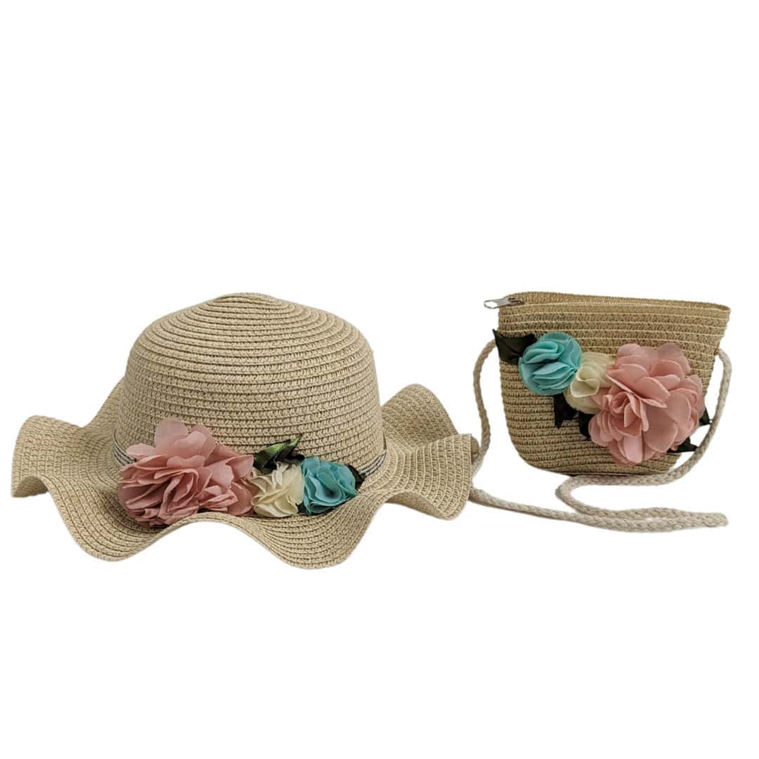 Παιδικό ψάθινο καπέλο με τσαντάκι και διακοσμητικά λουλούδια. Ιδανικό για καλοκαιρινές εμφανίσεις με στυλ και κομψότητα.