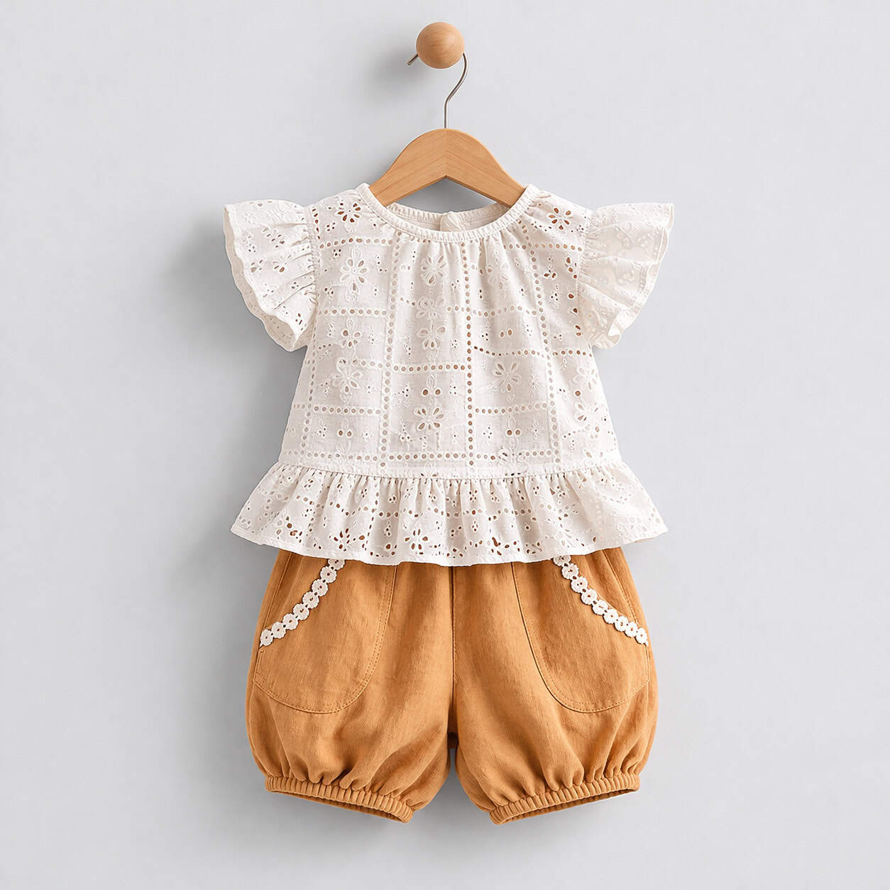 Το παιδικό σετ με τζιν σορτσάκι και μπλούζα αποτελείται από μία λευκή μπλούζα με τιράντες και ένα μοντέρνο τζιν σορτσάκι. Η μπλούζα διαθέτει διακοσμητικό φιόγκο και ρομαντικές λεπτομέρειες που χαρίζουν μία γλυκιά και κομψή εμφάνιση.
