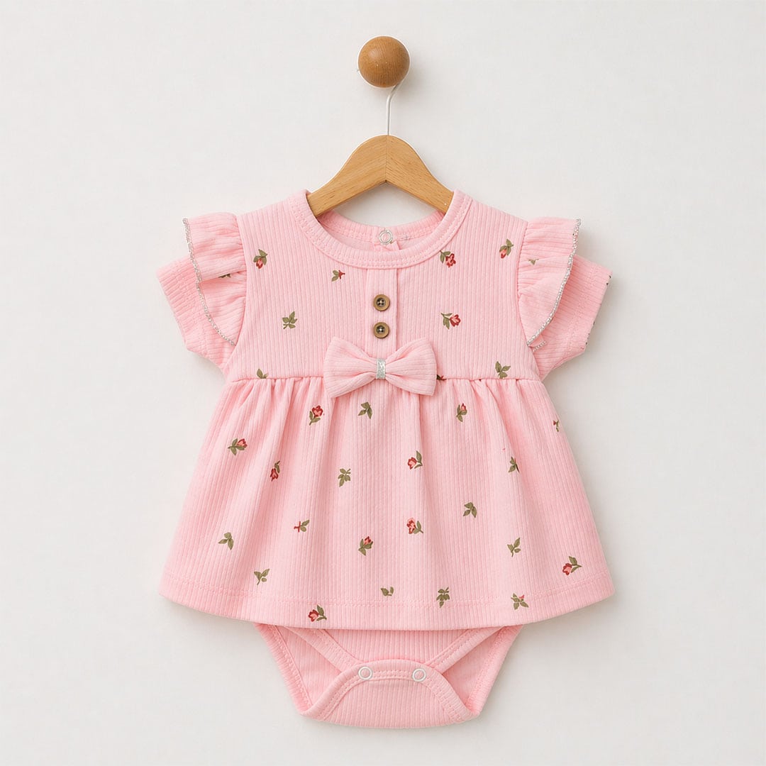 Βρεφικό φορμάκι φόρεμα ροζ με λουλουδάκια και φιόγκο. Άνετο και κομψό για καθημερινές αλλά και ξεχωριστές εμφανίσεις.