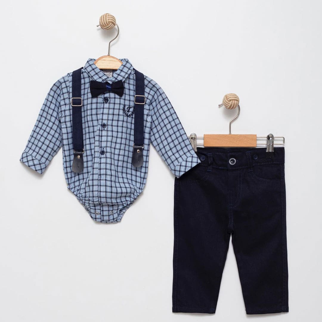 Βρεφικό Κοστούμι Καρό Με Τιράντες κ Παπιγιόν Γαλάζιο